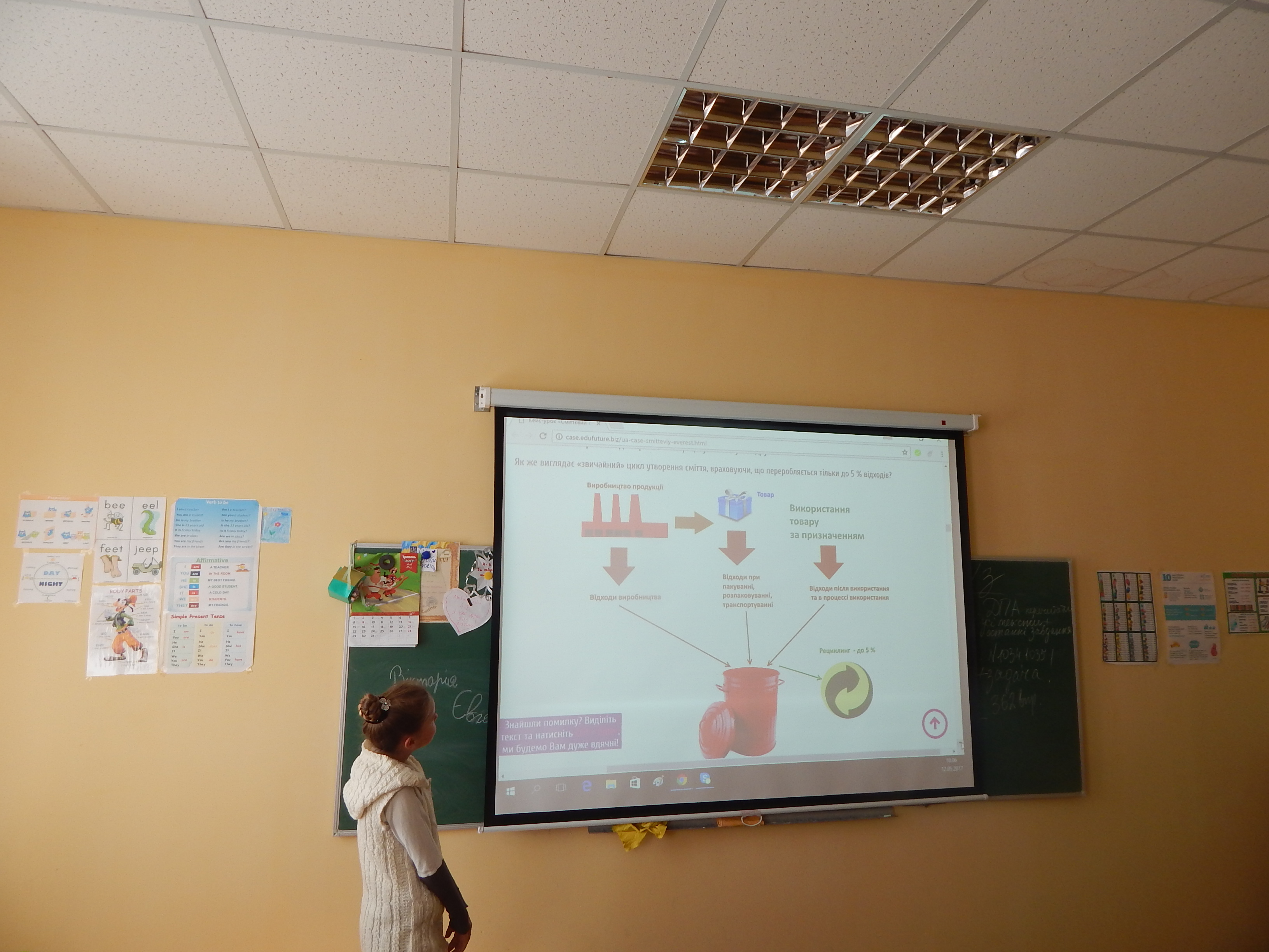 На уроці були розкриті наступні питання: Скільки сміття накопичилось в світі? Які методи переробки існують? Чому небезпечні відпрацьовані батарейки? Яке воно – мистецтво зі сміття?