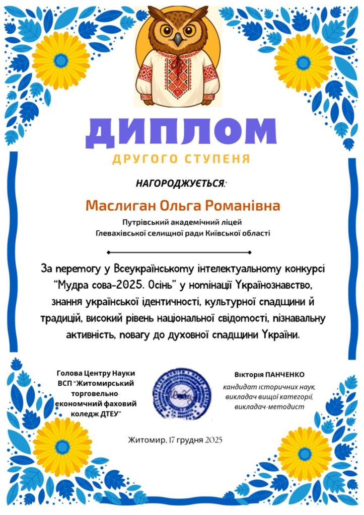 Щиро вітаємо ученицю 11 – і класу Маслиган Ольгу та учня 10 класу Занузданова Івана, їх керівника Педенко Ю.П., які за підсумками Всеукраїнського інтелектуального конкурсу «Мудра сова – 2025. Осінь» посіли ІІ місце у номінації “Українознавство”. Це чудове досягнення, яке свідчить про ваші глибокі знання і любов до рідної мови й культури. Бажаємо нових інтелектуальних звершень та наснаги у вивченні багатства українського слова та культурної спадщини.